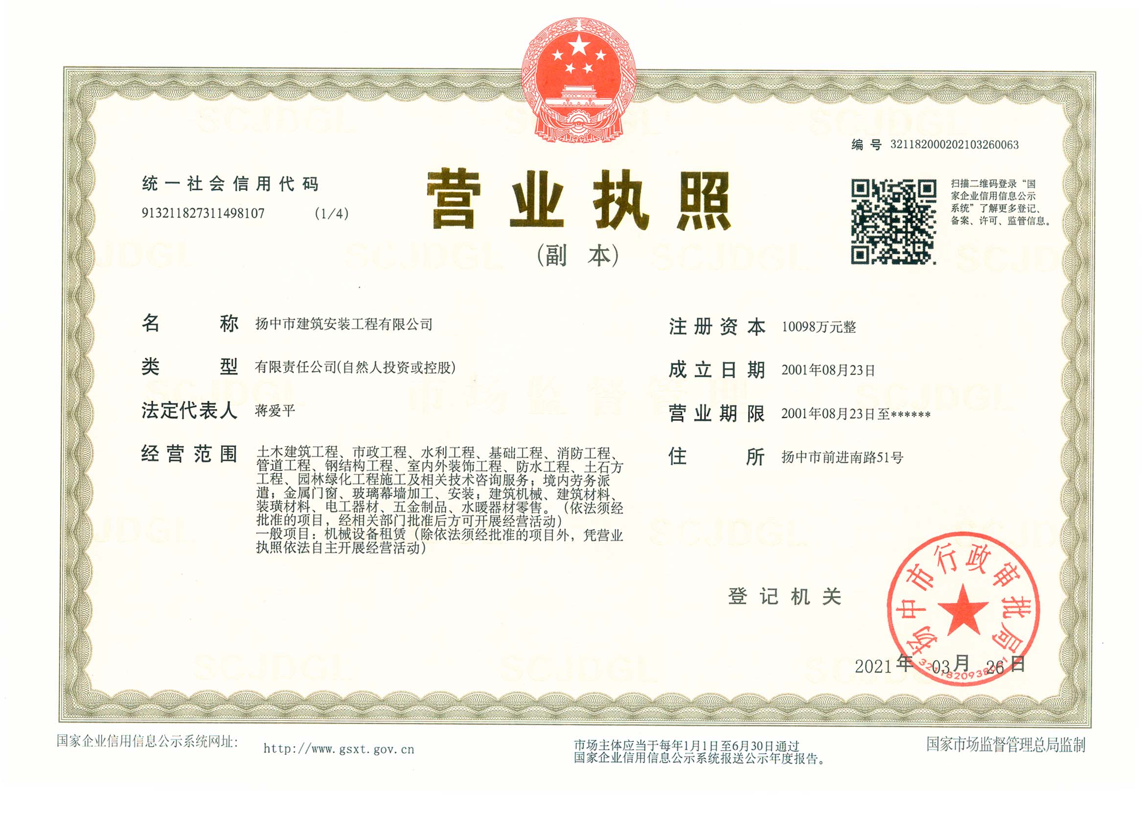揚(yáng)中市建筑安裝工程有限公司是房屋建筑工程施工總承包國(guó)家一級(jí)和市政公用工程施工總承包國(guó)家一級(jí)資質(zhì)施工企業(yè),并具有地基基礎(chǔ)工程專業(yè)承包、起重設(shè)備安裝工程專業(yè)承包、建筑裝修裝飾工程專業(yè)承包、消防設(shè)施工程專業(yè)承包、建筑機(jī)電安裝工程專業(yè)承包、鋼結(jié)構(gòu)工程專業(yè)承包等資質(zhì),在上海、南京、鎮(zhèn)江、蘇州、常州、沭陽、蕪湖、湖北襄陽等地設(shè)有分公司。60多年來,公司承建了一大批工業(yè)與民用建筑,為地方經(jīng)濟(jì)和...
